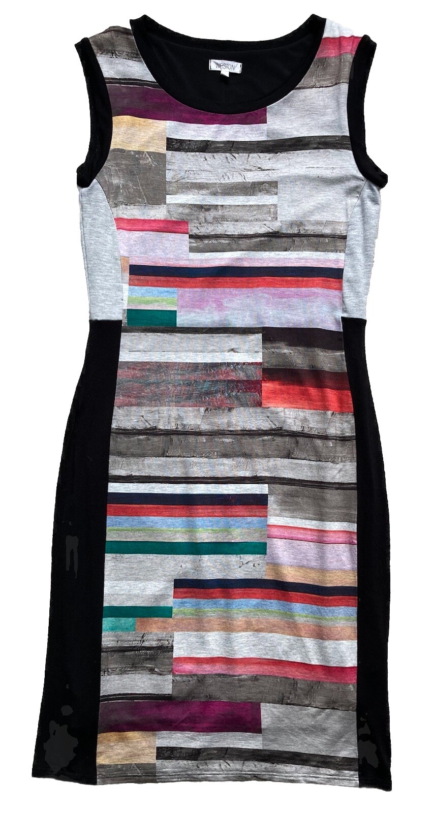 Weston tank dress with a color block design featuring a unique multicolor front. It is fully lined, sleeveless, round neckline and a pullover closure. The dress has a soft t-shirt feel.Size medium Hand wash Pit to pit 16”Length 38”