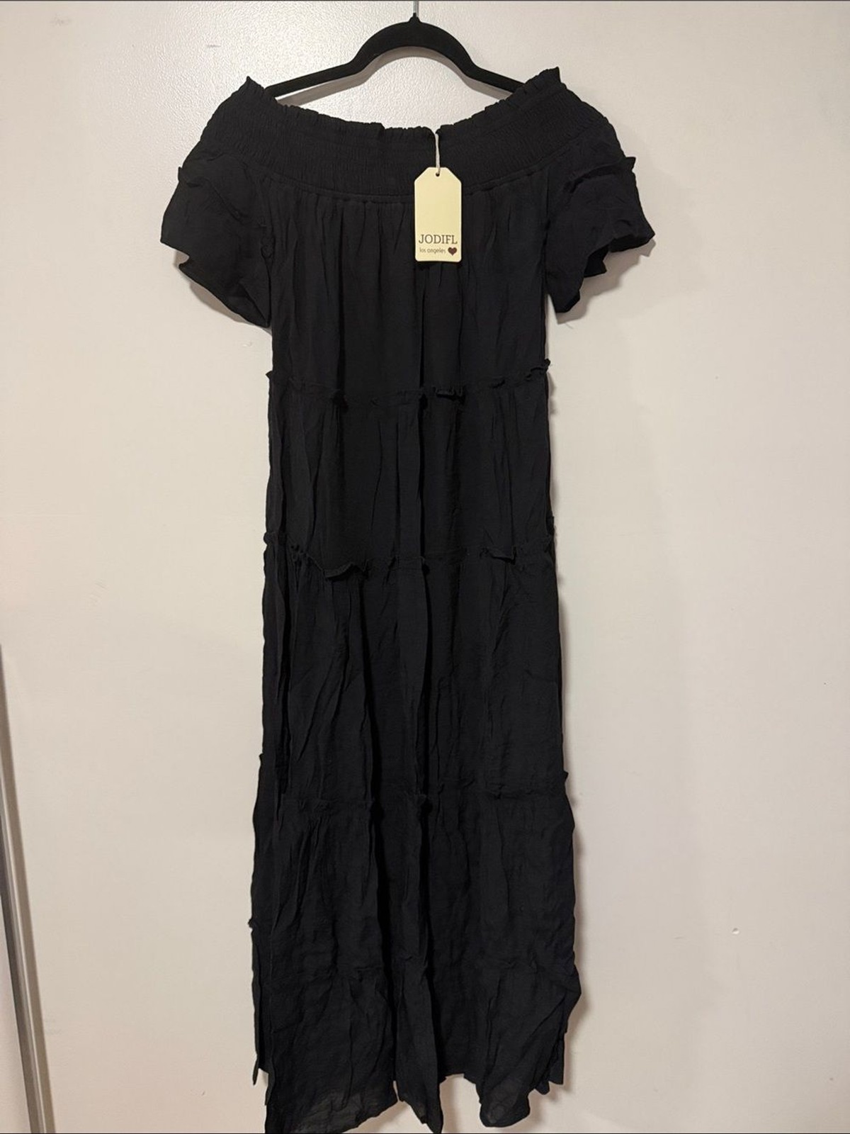 Lightweight black maxi with an off-the-shoulder smocked neckline. Tiered skirt creates soft movement. Short flutter sleeves add a feminine touch. Easy, breezy style for day or night.PTP 15 inches with out stretch 21 inches with stretch length 47 inches...