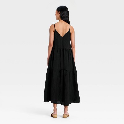 •Tiered maxi dress•Rayon-nylon blend dobby fabric•V-neckline and back•Adjustable straps•Tiered skirt•Side seam pock...